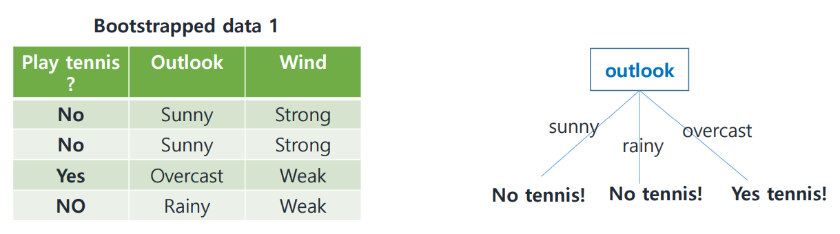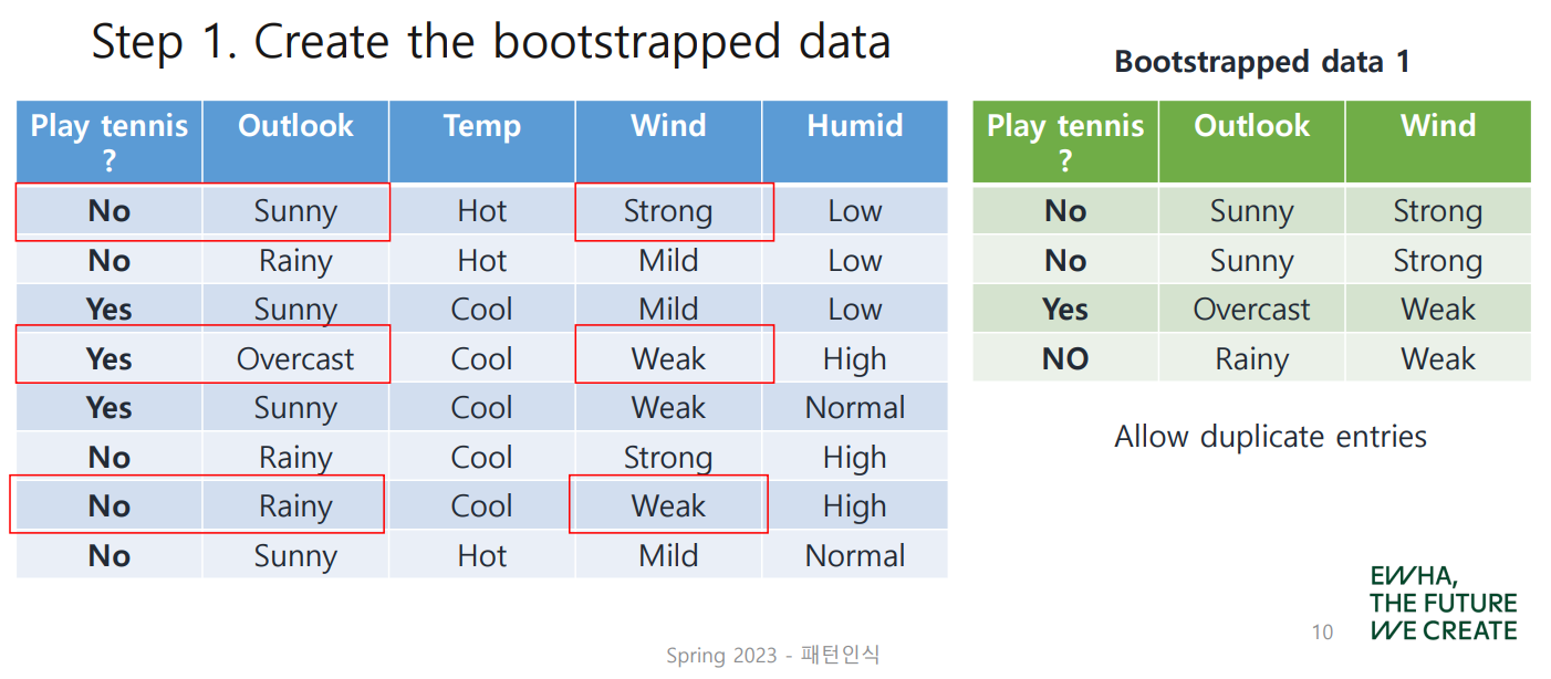feature의 개수는 제한되어 있으므로 다양한 tree를 도출해내기 위해(다양성을 보장하기 위해) Bootstrap Data를 잘 만들어야 한다!