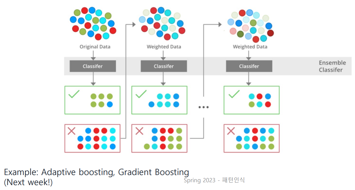 매 tree 형성 시 이전 tree에서 분류하지 못한 것(Misclassification)을 다음 tree에서 제대로 분류하겠다는 목표가 존재한다!