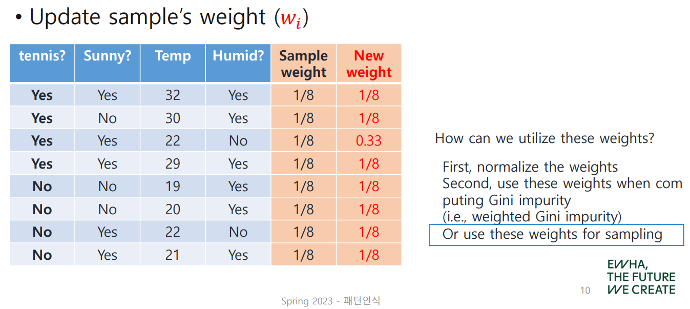 여기서는 새로운 weight를 정규화한 뒤 sampling에 이용하는 방법이 나와 있다. 새로운 weight는 sample을 pick할 때 확률로 이용되어, misclassificaiton을 일으킨 sample이 더 잘 고려되도록 할 수 있다. (weighted random)