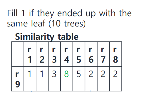 ex) 위 표를 보면 r4, r9는 8개의 tree에서 같은 결과를 도출하였다. (이를 두 row의 similarity가 높다고 말한다.)