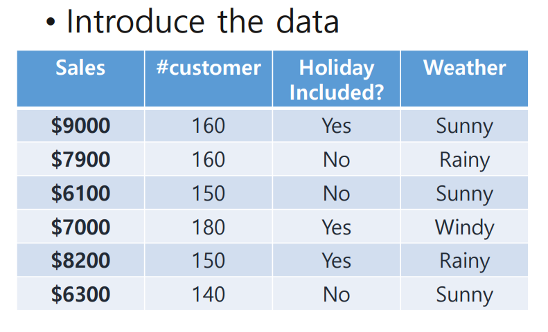 다음 data를 이용해 sales를 예측하는 regression model을 만들어보자.