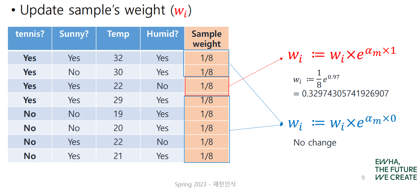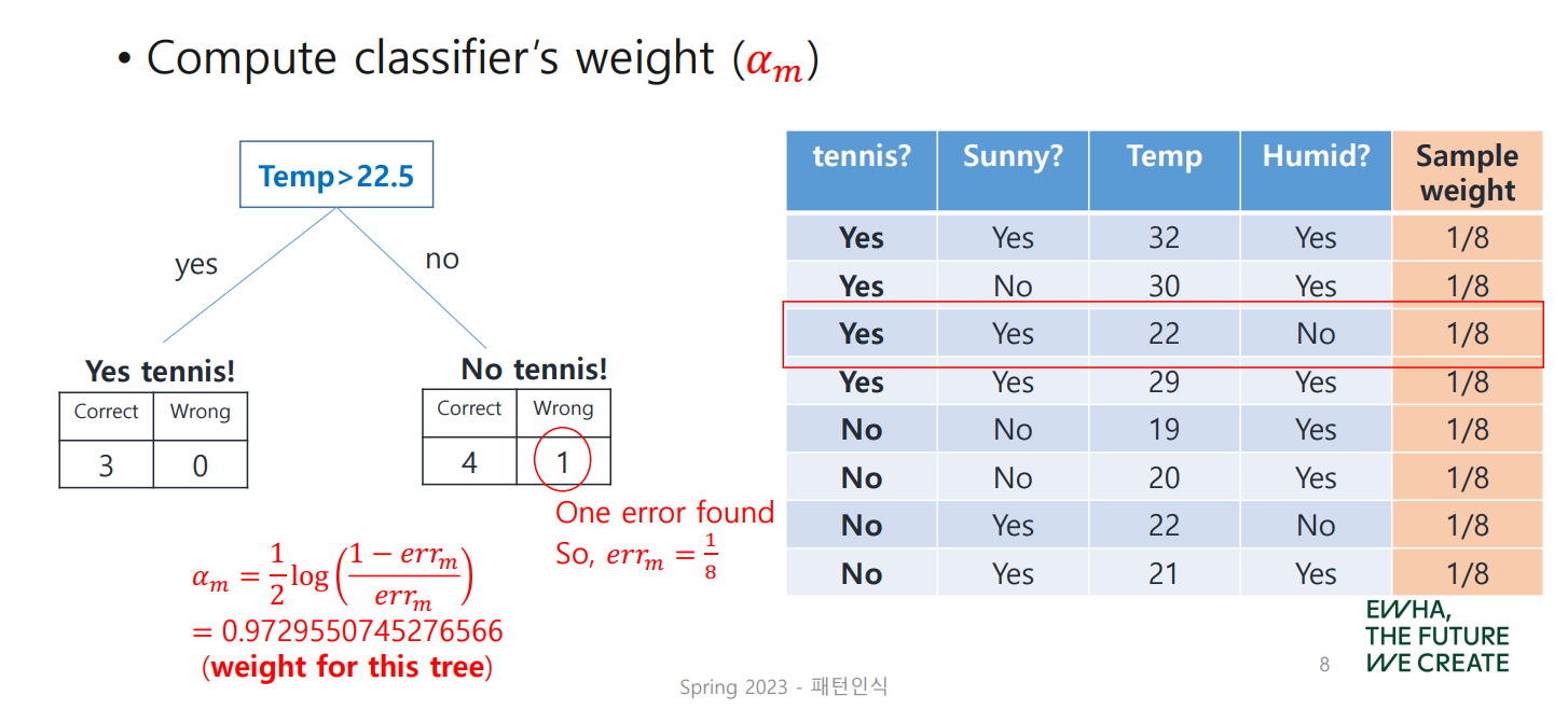 이전 tree에서 misclassification이 일어난 부분에 초점을 맞춰야 하므로, 다음과 같이 계산할 수 있다.