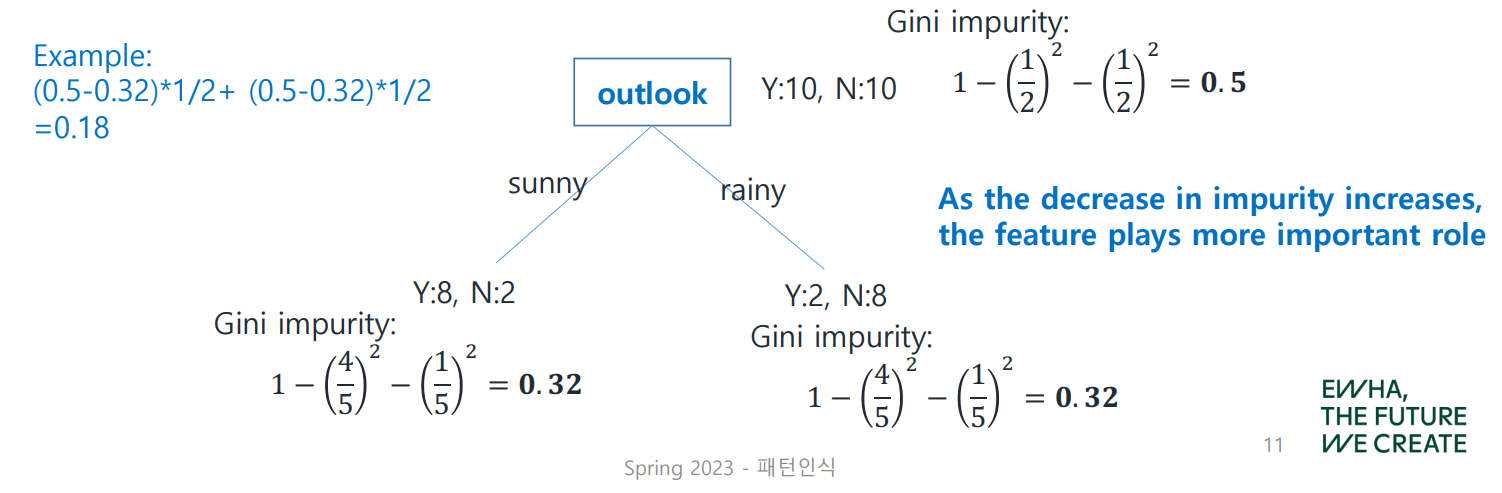 위 그림에 따르면, outlook이라는 feature의 gini importance는