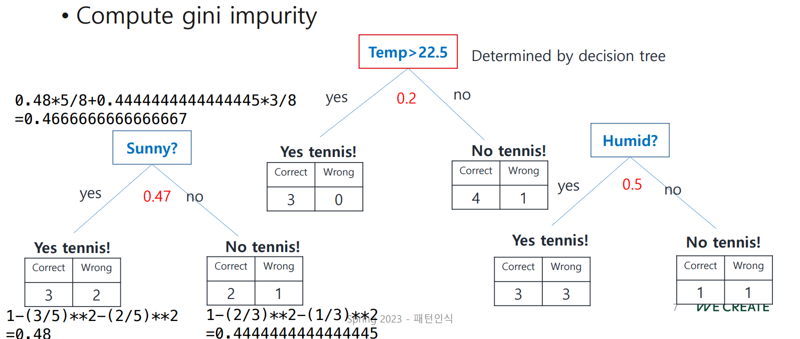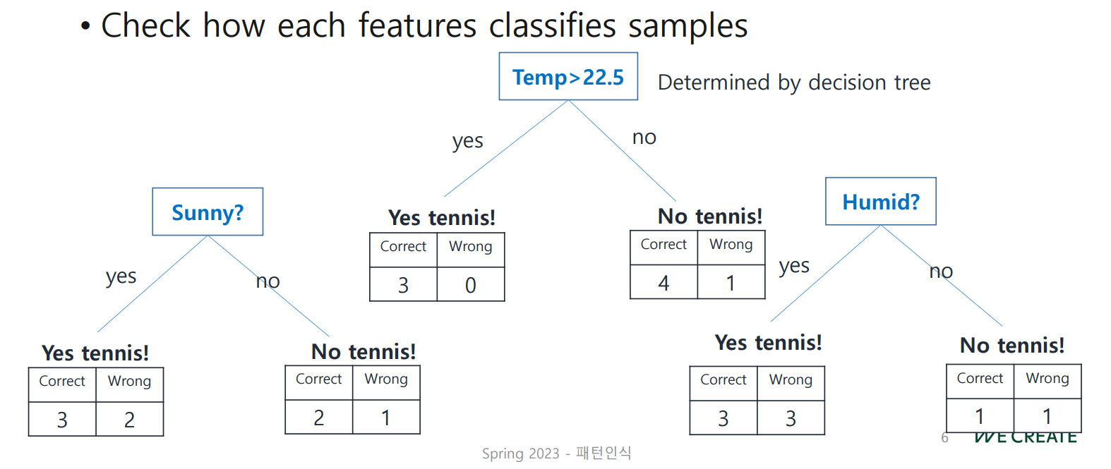 각 stump의 불순도를 계산하여, 개중 가장 잘 classify된 (불순도가 가장 작은) node를 선택한다.
