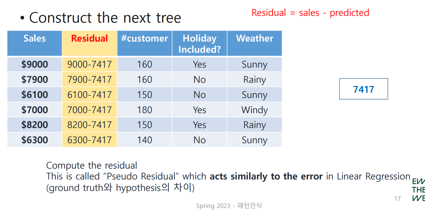 다음 tree를 구축하기 위해 residual을 구하자. 앞서 언급했듯 sales와 hypothesis(또는 predicted, 구체적인 값은 7417)의 차로 이루어지며, 이는 Linear Regression에서의 error와 비슷한 역할을 한다.