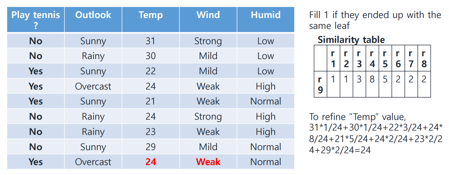 이 Similarity Table을 가중치로 이용하여 missing data에 적합한 값이 무엇인지 도출해낼 수 있다.