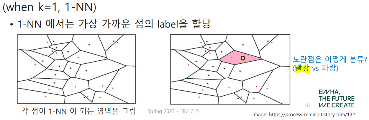 k-NN에서 직접적으로 decision boundary를 계산해주지는 않지만, 다음과 같이 voronoi tessellation을 그려 추론해볼 수 있다.