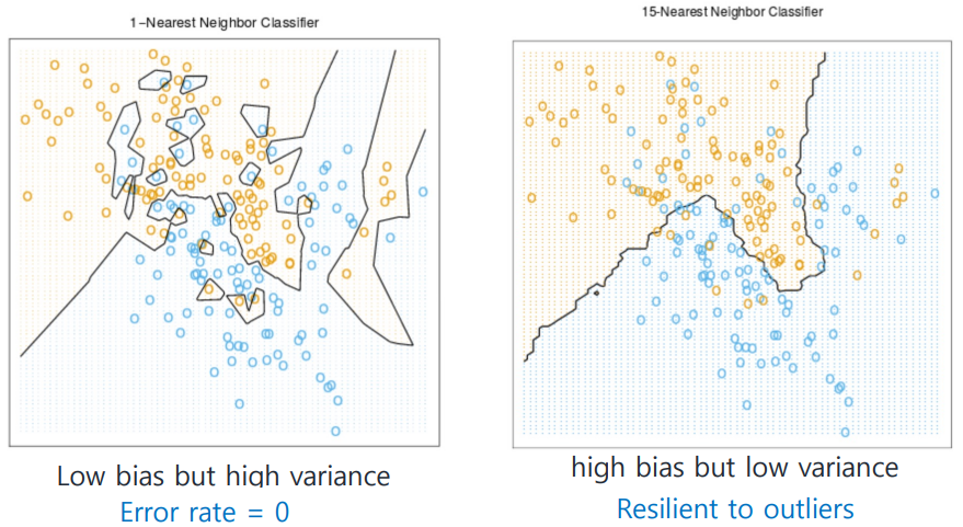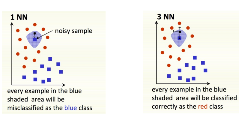 위 그림에서는 표시된 파란 점을 noise로 판단할 수 있다. 만약 k=1인 경우 noise sample 근처에 testing sample이 떨어지면 blue로 잘못 분류되지만, k를 증가시킬수록 red로 맞게 분류될 가능성이 커진다.
