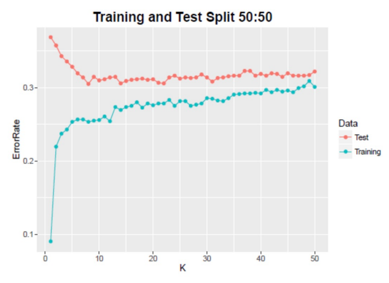 k값에 따른 training set과 testing set의 error를 나타낸 그래프이다. k값이 증가할수록 testing set에 대한 error가 감소하고 있음을 확인할 수 있다.