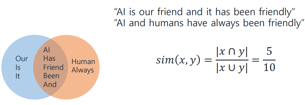 중복을 제외한 전체 단어 중 겹치는 것의 개수가 자카드 유사도이므로, 5/10이라는 값을 얻게 된다.