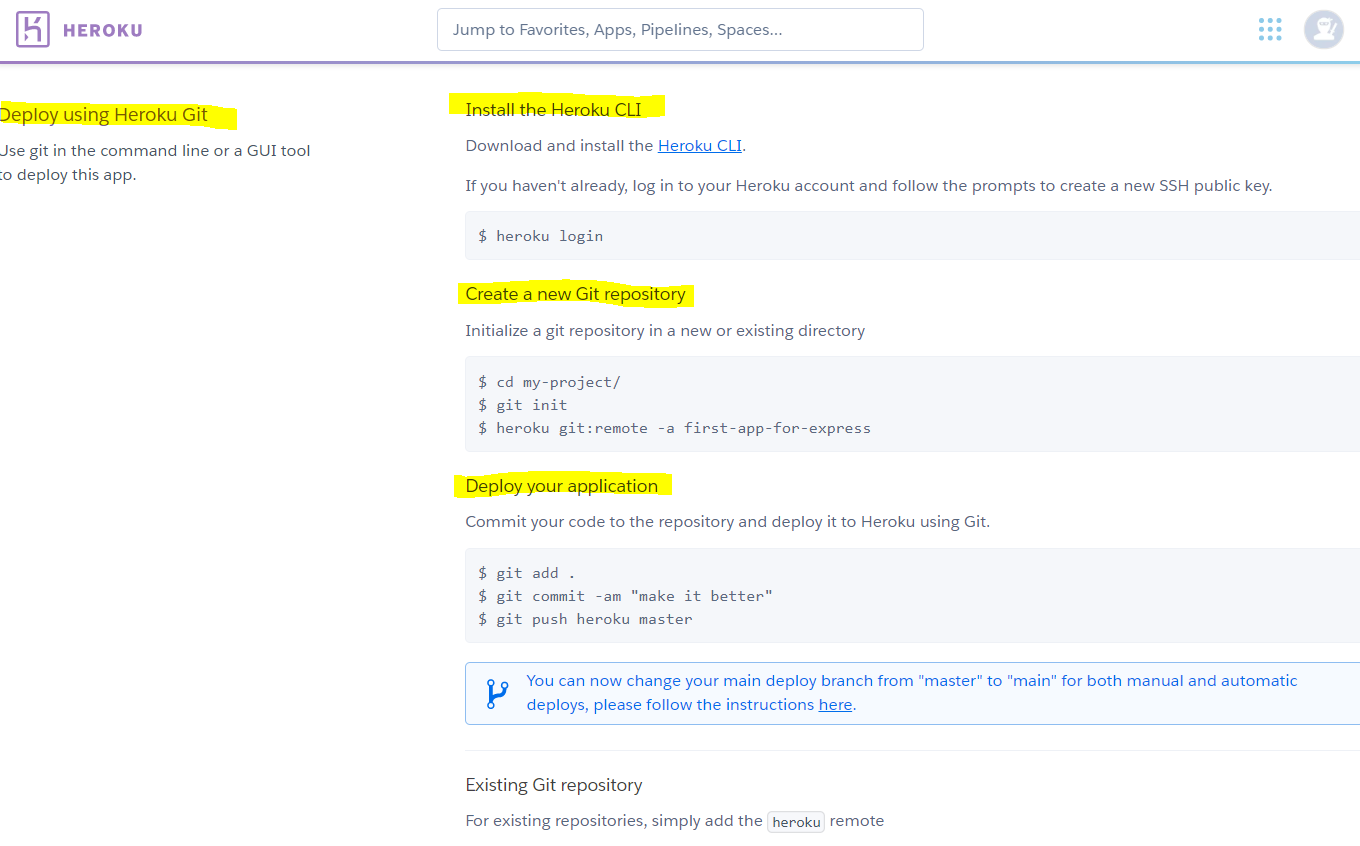 ↑ Git을 이용해 배포하는 법은 아주 간단합니다. 자신의 프로젝트(로컬 저장소)에 헤로쿠에서 마련해준 원격 저장소를 연결한 후, 그 원격 저장소에 푸쉬하기만 하면 됩니다!