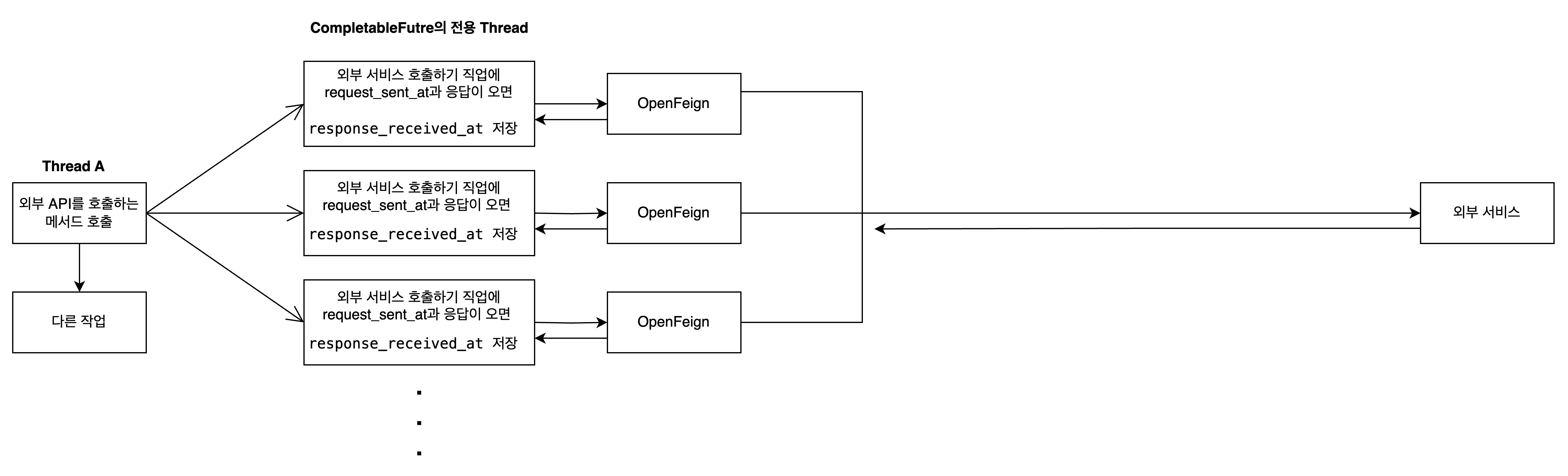 - 외부 API의 TPS를 고려하여 1초의 간격으로 요청이 갈 수 있도록 요청을 동시에 보내기 위해서 비동기로 호출하고 마지막에 해당 비동기 호출들의 응답이 돌아올 때까지 기다렸다.