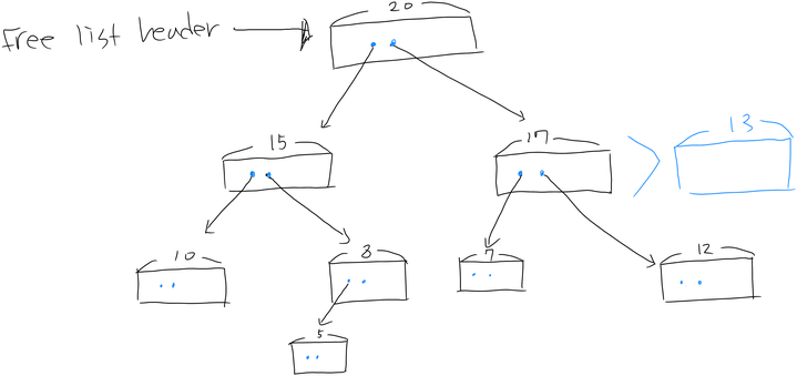 삽입 할 때 먼저 루트와 비교를 하고 삽입하려는 메모리공간의 크기가 더 작다면 루트의 자식중에 메모리 크기가 큰 기준으로 큰 노드로 가준다.
