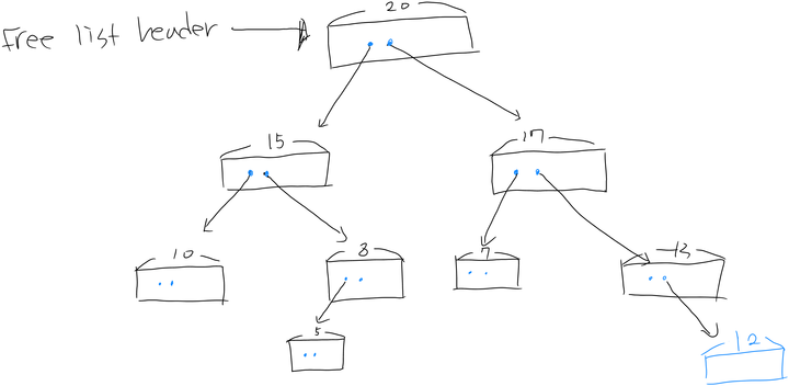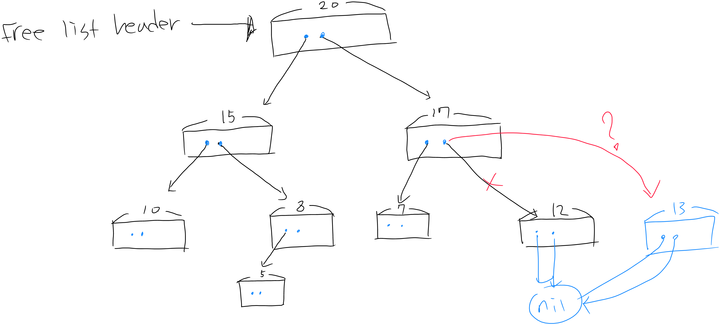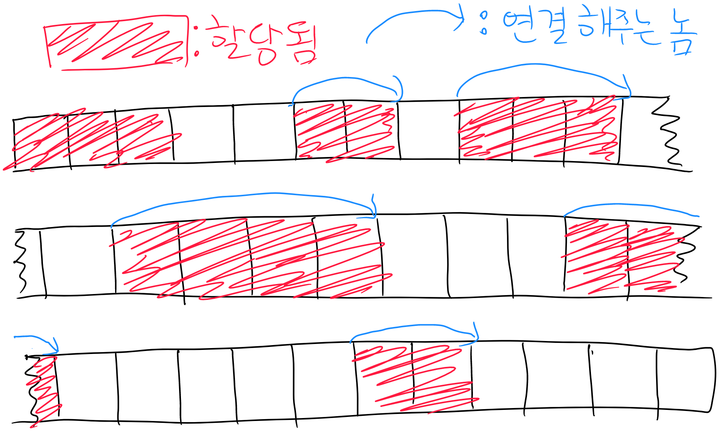 만약 공간이 16보다 작다면 네 개의 공간을 할당할 수 없으므로 공간을 전부 할당해주면 된다.static void place(void *bp, size_t asize) { splice_free_block(bp); // free_list에서 해당 블록 제거 // size_t csize = GET_SIZE(HDRP(bp)); // 현재 블록의 크기 // if ((csize - asize) >= (2 * DSIZE)) { // 차이가 최소 블록 크기 16보다 같거나 크면 분할 PUT(HDRP(bp), PACK(asize, 1)); // 현재 블록에는 필요한 만큼만 할당 PUT(FTRP(bp), PACK(asize, 1)); // PUT(HDRP(NEXT_BLKP(bp)), PACK((csize - asize), 0)); // 남은 크기를 다음 블록에 할당(가용 블록) PUT(FTRP(NEXT_BLKP(bp)), PACK((csize - asize), 0)); add_free_block(NEXT_BLKP(bp)); // 남은 블록을 free_list에 추가 }else { PUT(HDRP(bp), PACK(csize, 1)); // 해당 블록 전부 사용 PUT(FTRP(bp), PACK(csize, 1)); } }