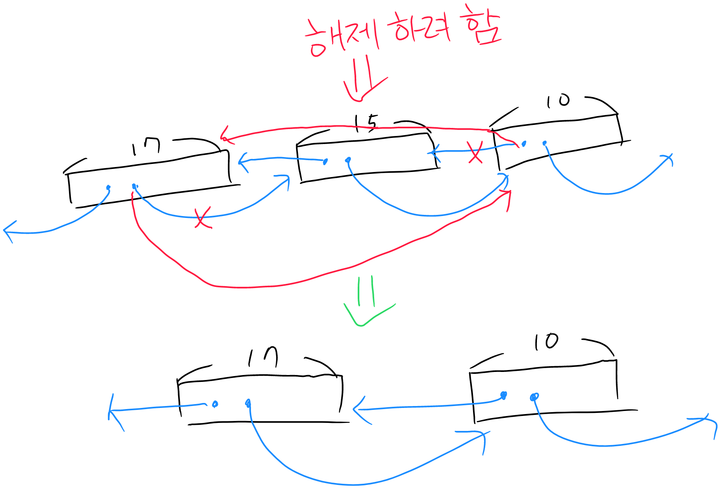 해제하려는 블록의 이전 블록의 다음블록을 / 해제하려는 블록의 다음 블록으로 / 설정해 주고
