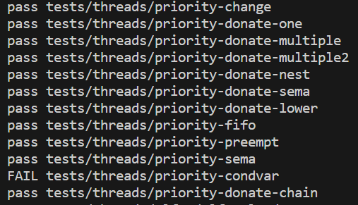 테스트 케이스는 총 12개로 우선순위 스케쥴링을 구현하는데 있어서 필수적인 요소들이 테스트 케이스에 들어갔다. 나는 이 중 priority-condvar을 제외한 나머지 테스트케이스에서 통과했다.