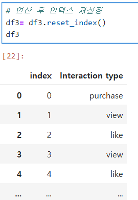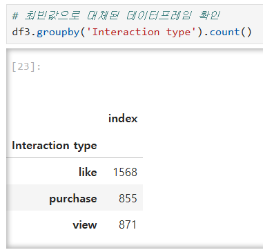fillna()를 통해 Interaction type 컬럼의 최반값으로 null 값을 채우면 결과는 아래와 같다.df3 = df3['Interaction type'].fillna(df3['Interaction type'].mode()[0])