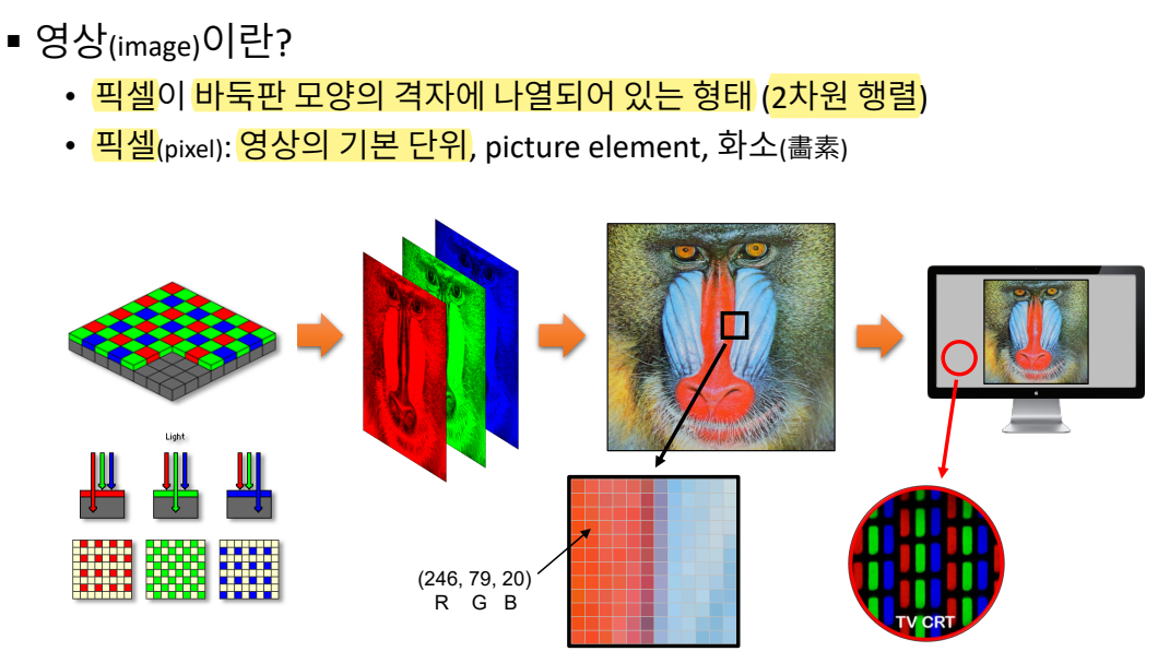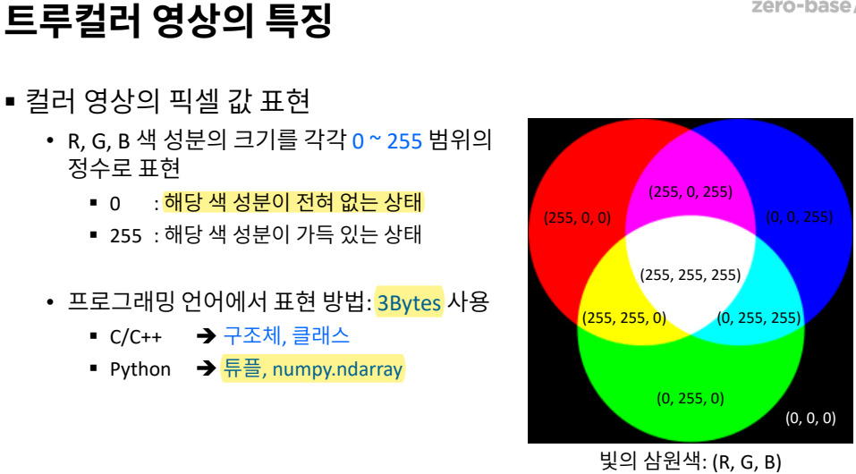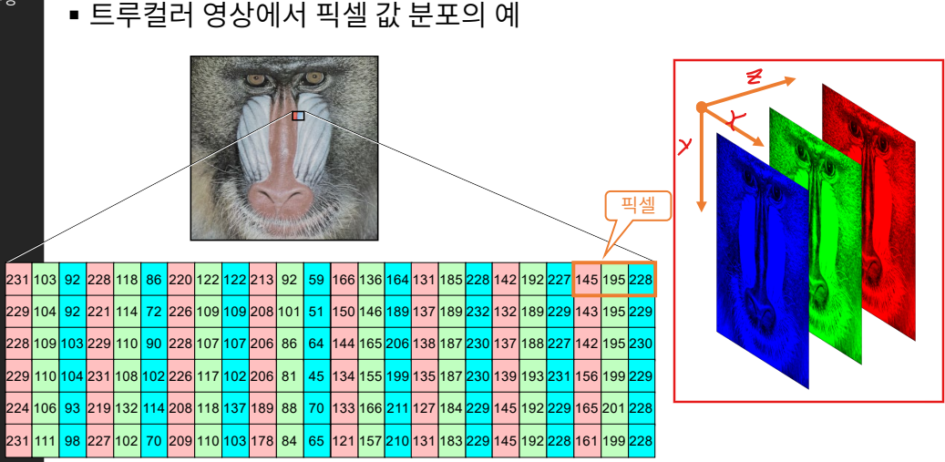 각 성분(R, G, B)별로 이미지를 만들어서 3차원으로 표현하는 방식도 있는데(왼쪽 빨간 상자) 보통 파이썬을 이용해서 OpenCV를 다룰 때 주로 이 방식으로 다룬다.
