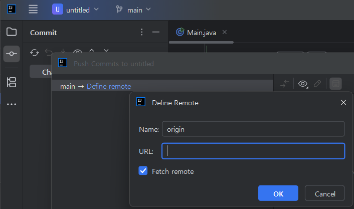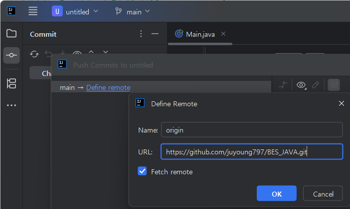 push๋ฅผ ๋๋ฅด๋ฉด define remote ๋ฒํผ์ด ๋์ค๋๋ฐ ์ฌ๊ธฐ์ ๊นํ๋ธ remote repository ๋งํฌ๋ฅผ ์ ๋ ฅํด ์ฃผ์ด์ผ ํ๋ค.