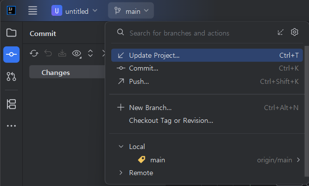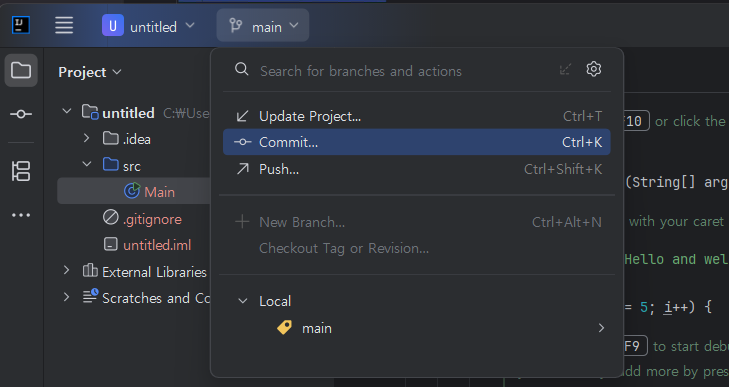 ์ด์ version control ๋ฒํผ ์์น์ git ์์ด์ฝ๊ณผ ๋ ํฌ์งํ ๋ฆฌ ์ด๋ฆ main์ด ๋ฌ๋ค.