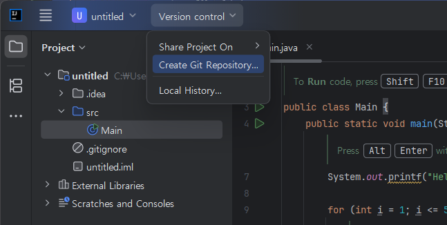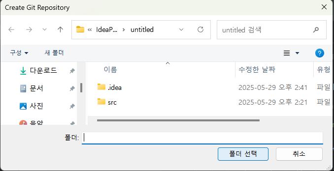 ์ธํ ๋ฆฌ์ ์ด์์ ํ๋ก์ ํธ ์ด๋ฆ ์ version control์ ๋๋ฅด๊ณ create git repository ํด๋ฆญํ๋ค.