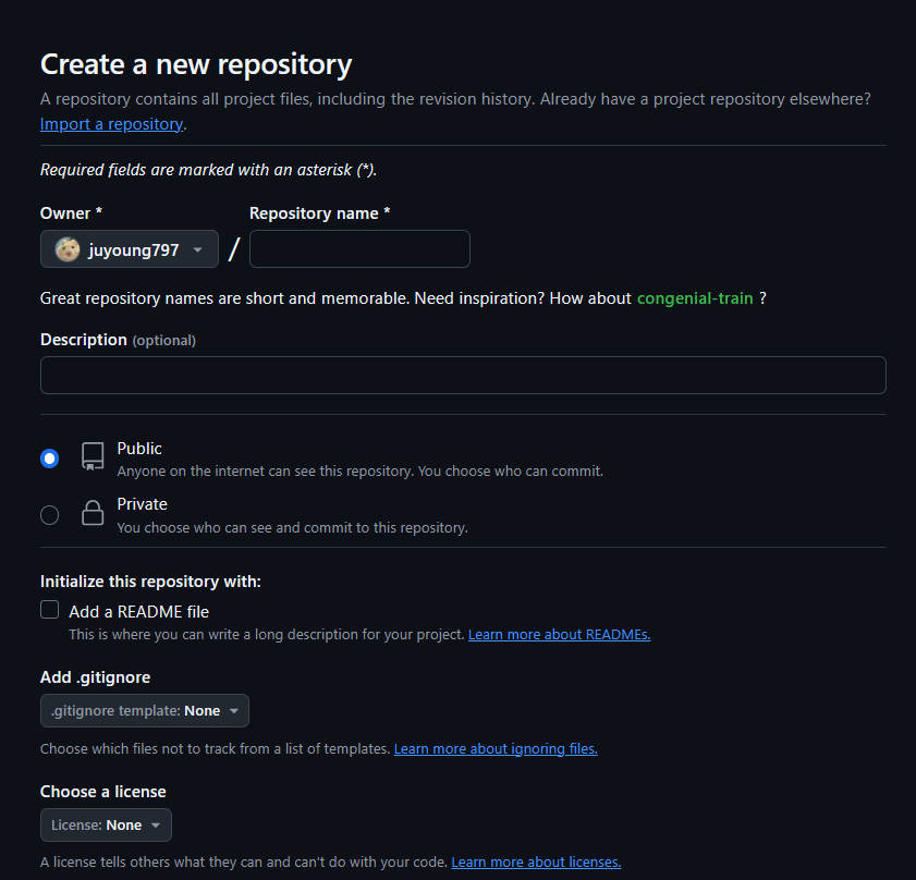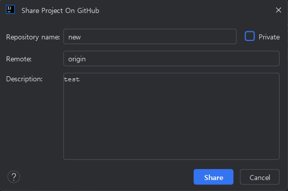 ๊นํ๋ธ์์ ์์ฑํ๋ ๊ฒ๊ณผ ๋น์ทํ๊ฒ ์ด๋ฆ๊ณผ private/public ์ ํํ ์ ์๊ณ ์ค๋ช ๋ ์ ์ ์ ์๋ค. ์์ฑํ๊ณ Share๋ฅผ ๋๋ฅด๋ฉด ๊นํ๋ธ์ ์ ์ ์ฅ๋ ๊ฒ์ ํ์ธํ ์ ์๋ค.
