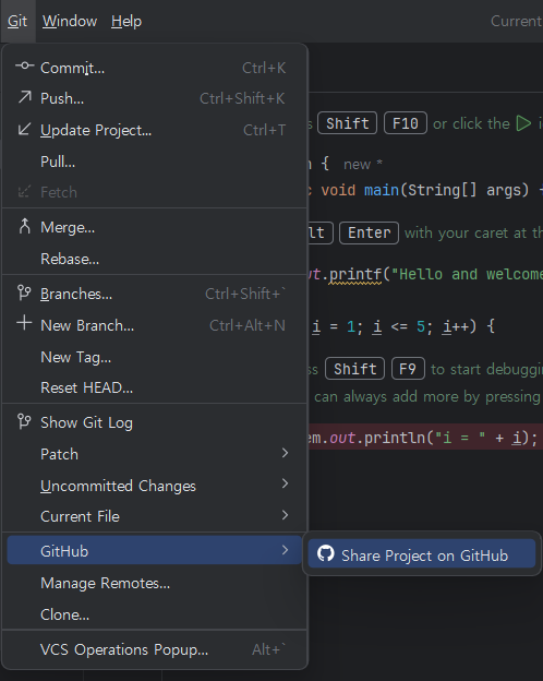 ์๋จ ๋ฉ๋ด ์์ด์ฝ์ ๋๋ฌ git ํญ์ ๋ค์ด๊ฐ ๋ค์ Github -> Share Project on GitHub ํด๋ฆญํ๋ค.