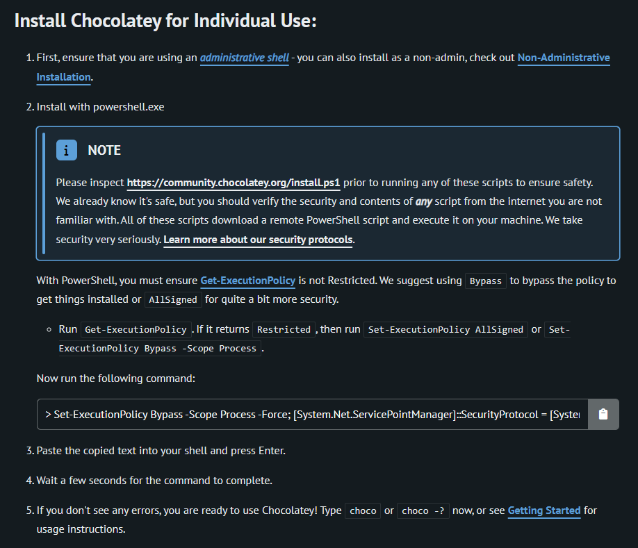 Set-ExecutionPolicy Bypass -Scope Process -Force; [System.Net.ServicePointManager]::SecurityProtocol = [System.Net.ServicePointManager]::SecurityProtocol -bor 3072; iex ((New-Object System.Net.WebClient).DownloadString('https://community.chocolatey.org/install.ps1'))