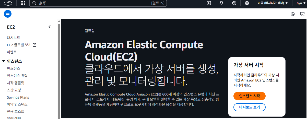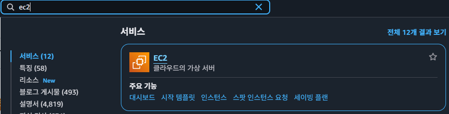 ์๋ฃ ํ ๊ฒ์์ฐฝ์ ec2๋ฅผ ๊ฒ์ํด์ ๋ค์ด๊ฐ๋ค.