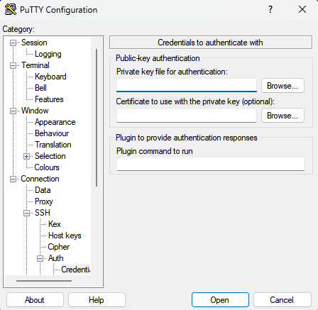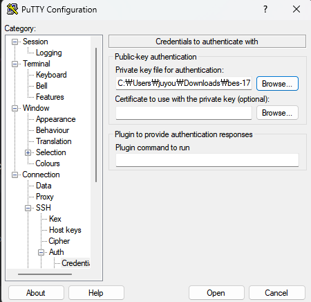 Connection > SSH > Auth > Credentials ๋ก ๋ค์ด๊ฐ Private key file for authentication ๋ฅผ ์ฐพ๋๋ค.