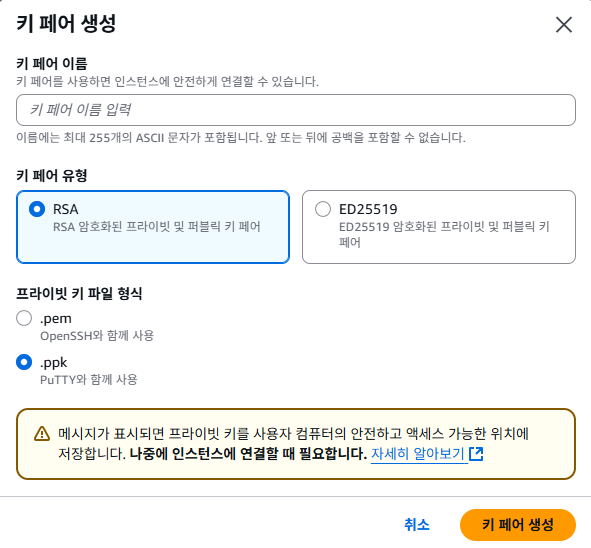 โ๏ธ ์๊น ๋ง๋ aws ์๋ฒ์ ์ ์ํ๊ธฐ ์ํด์๋ ๋จผ์ ์๊ฒฉ์ฆ๋ช ํค๋ฅผ ์ค์ ํด ์ฃผ์ด์ผ ํ๋ค.