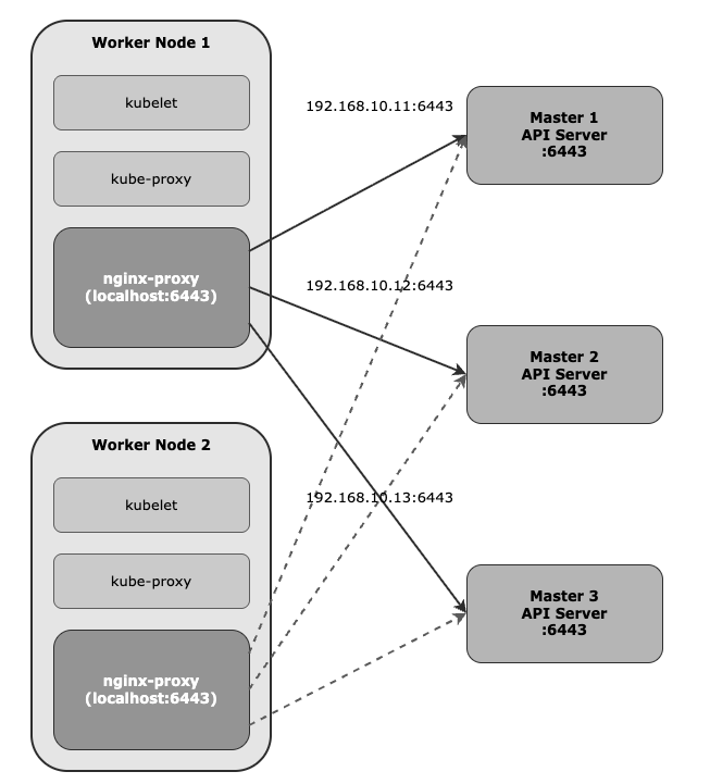 Worker 노드는 자체적으로 nginx static pod를 실행하여 API Server에 대한 Client-Side 로드밸런싱을 수행한다.