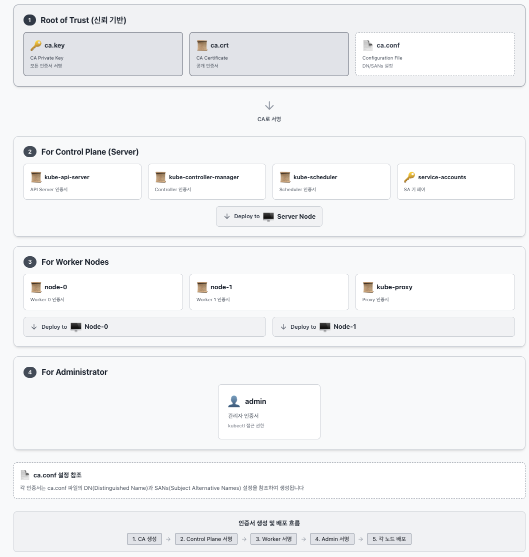 node-0, node-1): CA 인증서와 본인들의 Kubelet 인증서 필요.server): CA 키/인증서, API Server 인증서, Service Account 키 필요.# 1. Worker Node 배포 (node-0, node-1)