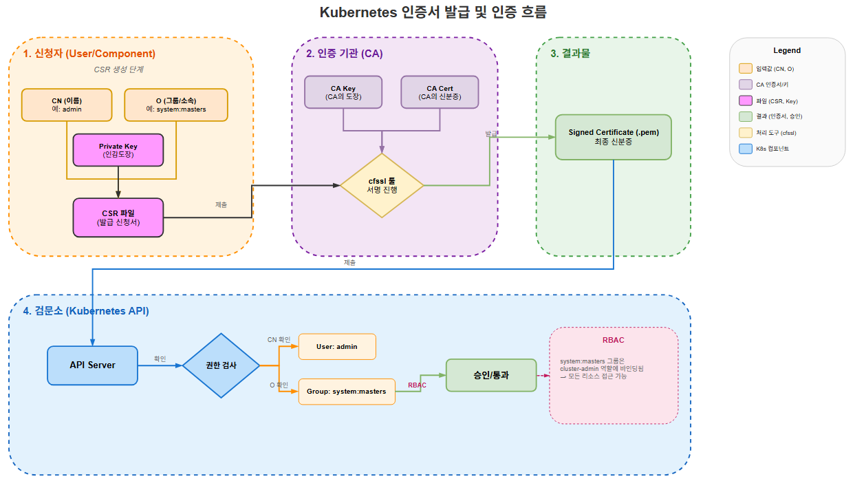 O=system:masters(이 그룹은 RBAC 검사를 무시하고 무조건 슈퍼유저 권한을 가짐. 매우 중요!)- API Server: