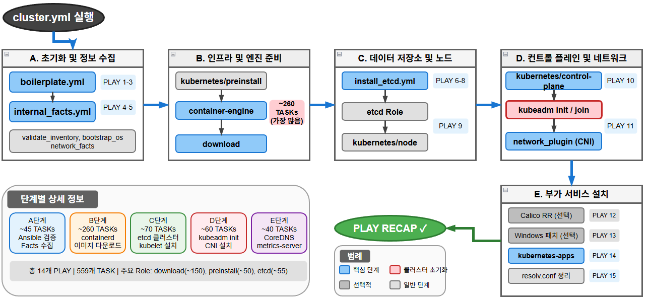 | B | Prepare for etcd install | (PLAY 5 계속) preinstall, container-engine, download | k8s_cluster:etcd |