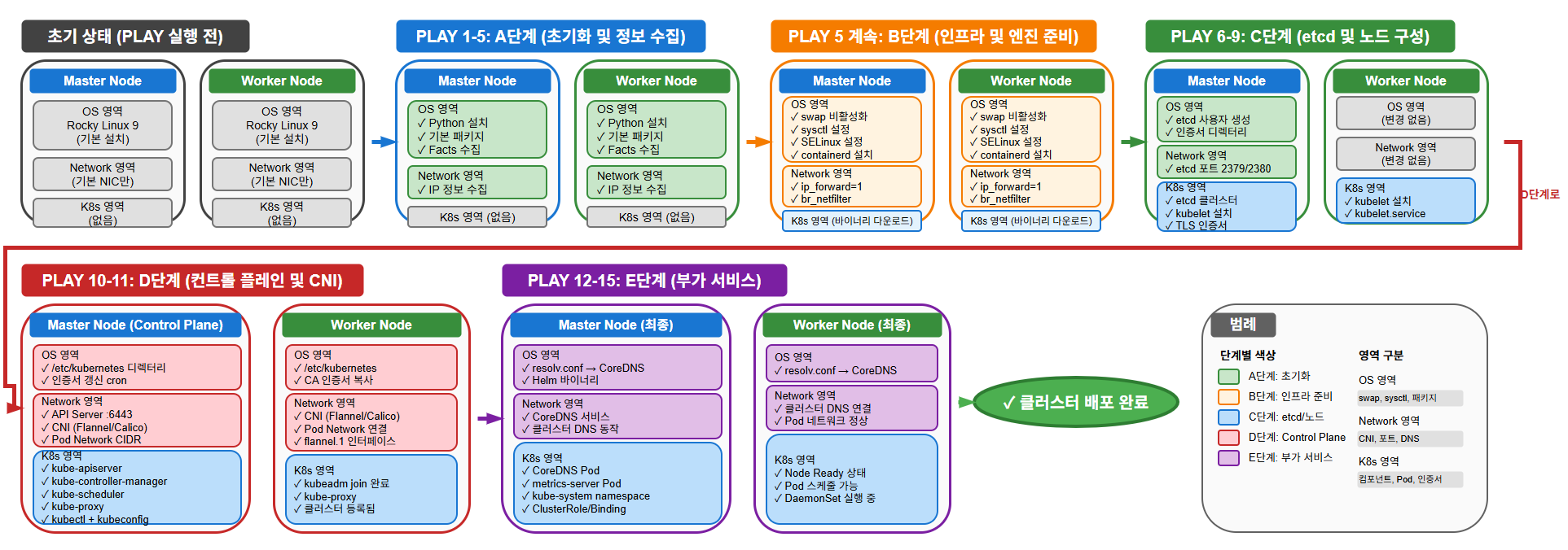각 PLAY별로 각 노드(Master/Worker)와 영역(OS/Network/K8s)에서 변화 과정 추적