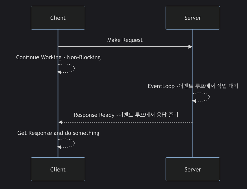 위 그림은 비동기 프로그래밍에서 클라이언트가 요청을 보낸 후, 이벤트 루프가 서버의 응답을 기다리고 클라이언트가 다른 작업을 수행할 수 있음을 보여줍니다. 이벤트 루프는 서버의 응답이 준비되면 클라이언트에게 이를 전달하여 처리하게 합니다.