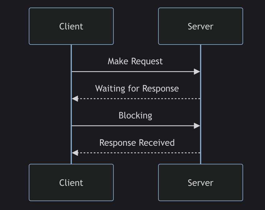 위 그림은 동기 프로그래밍에서의 블록킹을 설명합니다. 클라이언트가 서버에 요청을 보내면, 서버의 응답을 받을 때까지 클라이언트는 다른 작업을 수행하지 못하고 대기합니다.