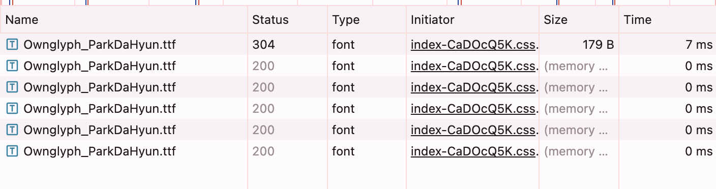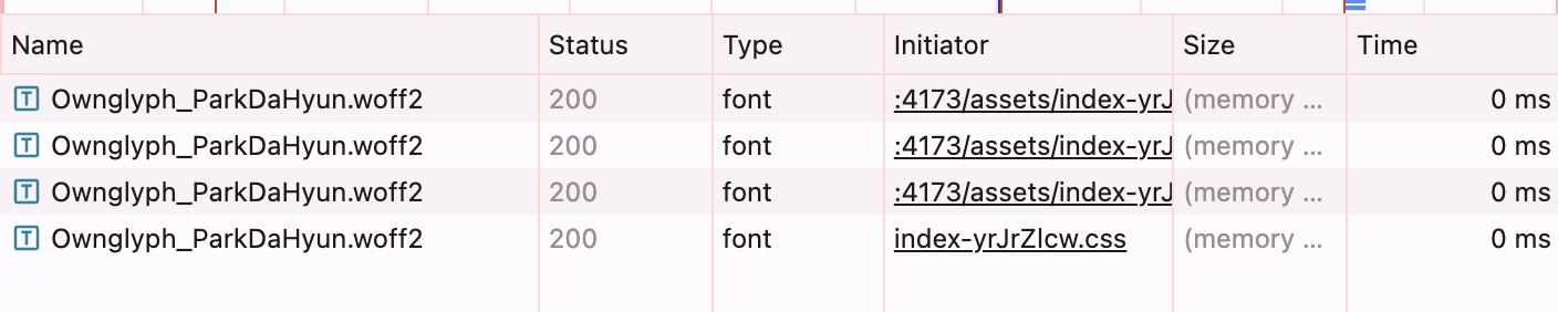 ⚙️ 개발 환경에서는 직접 호스팅 방식 5~11ms 정도 걸리고 TTF 파일로 첫 로딩에 2.0MB가 소요되었지만, 이는 실제 사용자 경험과는 차이가 있다.