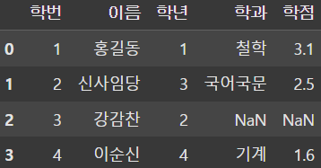 '학점' : [3.1, 2.5, 1.6, 4.5]