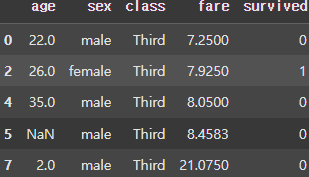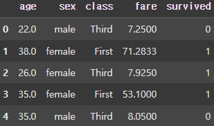 df = titanic.loc[:, ['age', 'sex', 'class', 'fare', 'survived']]