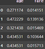# 모든 행에 대해 age, fare 컬럼만 추출한다.