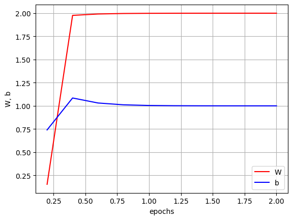 이와 같이 loss 함수에 learning rate를 곱한 값을 이용하여 주어진 epochs 동안 W와 b를 최적화한다. 이때 이러한 과정을 경사하강법이라고 하는데, 이 역시 추후에 다루겠다. 학습을 진행하면서 W와 b 값을 출력해보면, 점점 W = 2, b = 1에 가까워 지는 것을 확인 할 수 있다.