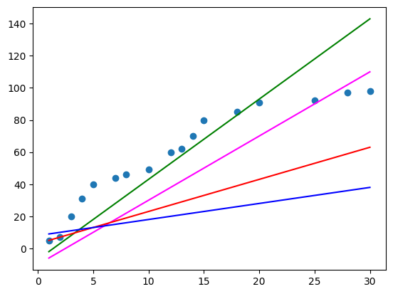 이렇게 임의로 1차 방정식을 이용해 데이터 scatter 위에 직선을 그렸는데 위 그림에서는 초록색 직선()이 가장 데이터와 가까워 보인다. 이러한 작업을 통해 데이터와 가장 가까운 직선을 찾는 것을 Regression 이라고 한다.