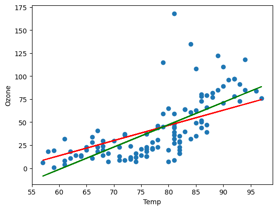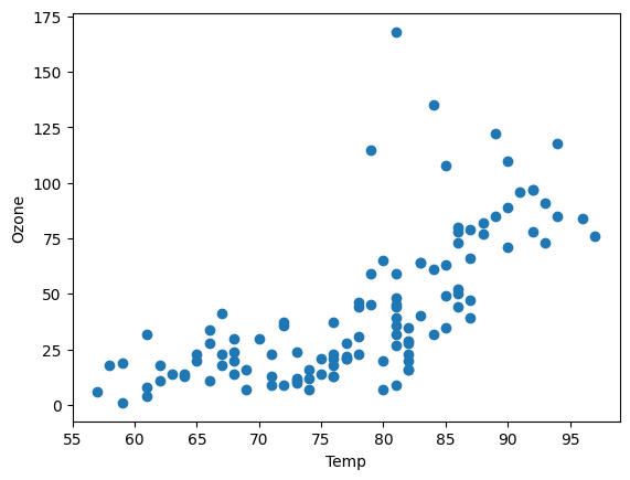 Ozone Data Set을 사용하여 코드를 전체적으로 확인하고, 직접 만든 코드와 sklearn library를 사용하여 만든 코드를 비교해보자. 이때 온도 변화량에 따른 Ozone량을 알아볼 것이기 때문에 독립변수는 Temp이고 종속변수는 Ozone이다. 여기선 결치값만 처리하였다.