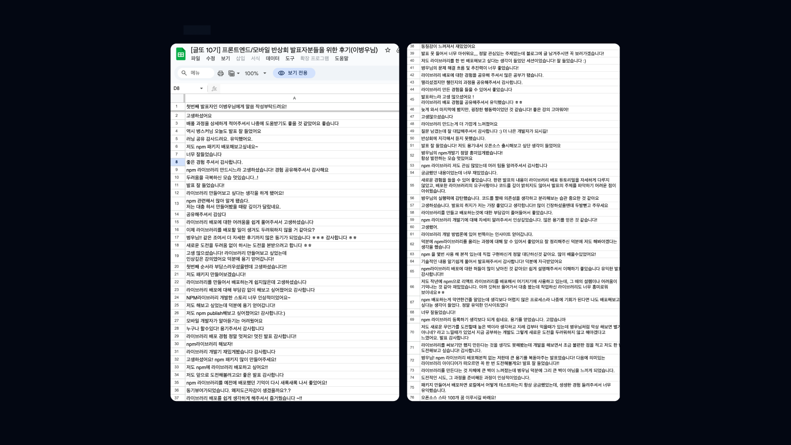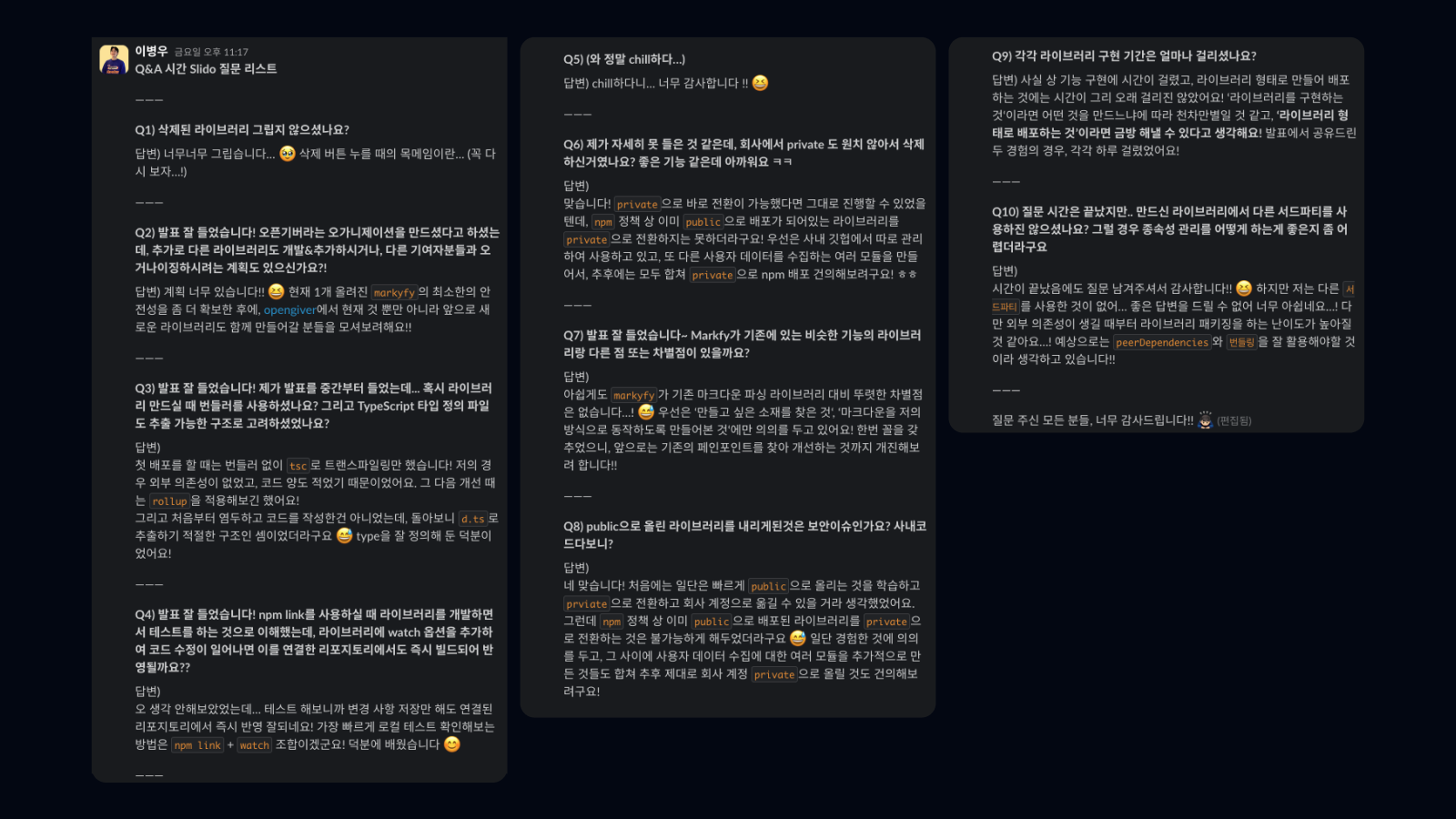 제가 이 발표를 통해 이야기드리고 싶었던 내용은 "npm 라이브러리 만들기에 대한 막연한 장벽을 허물자!"였습니다. 이 시트를 통해 참여자 분들의 목소리를 들어보았을 때, 다행히 그 의도가 분명히 전해졌다는 것을 알 수 있었어요!! 실제로 용기를 얻었다는 말씀을 들었을 때 더할 수 없는 충만감을 느꼈습니다...! 🥺