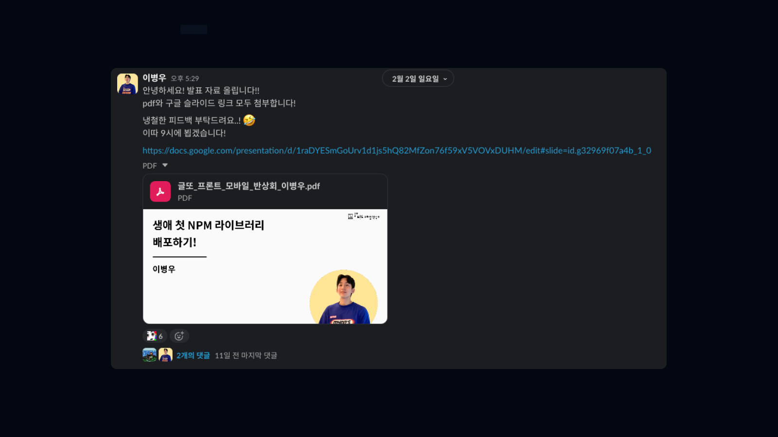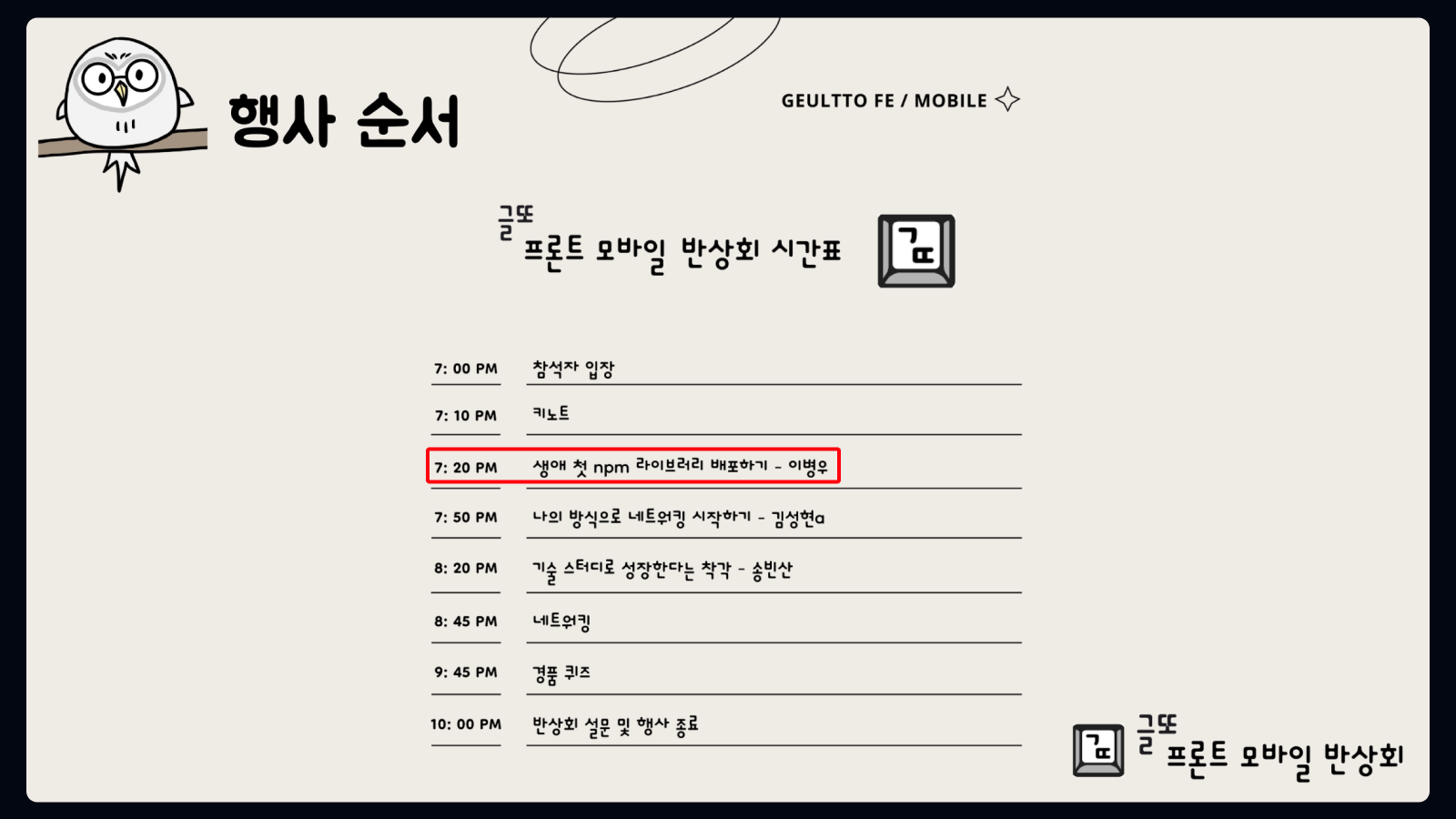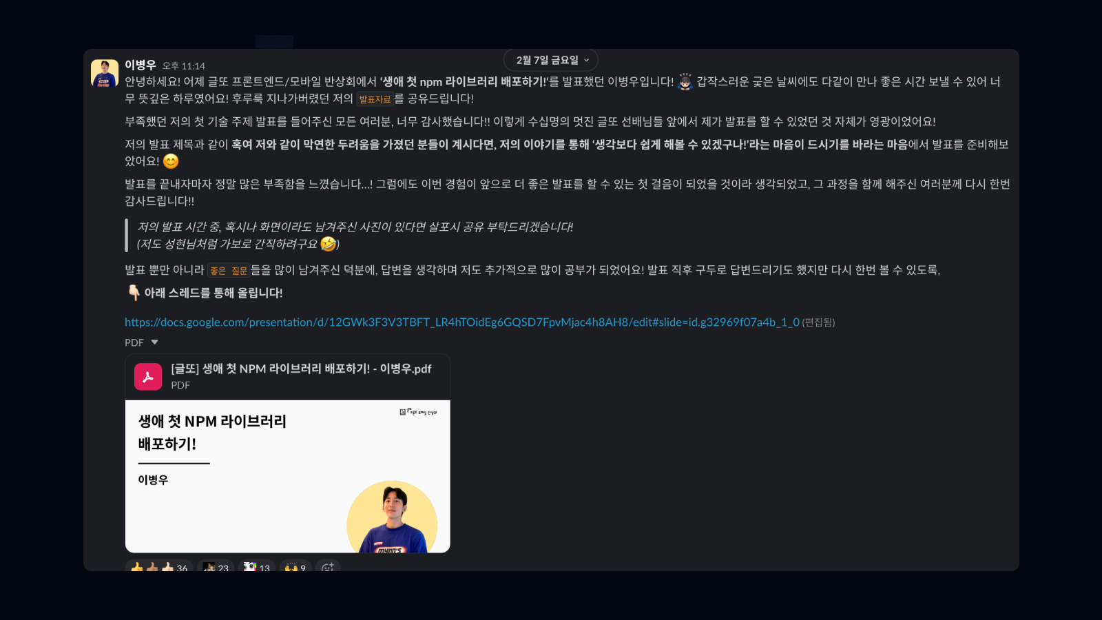 이번 글은 발표자로서의 후기이며, 발표에 대한 내용은 따로 다룰 예정입니다. (생애 첫 npm 라이브러리 배포하기!)