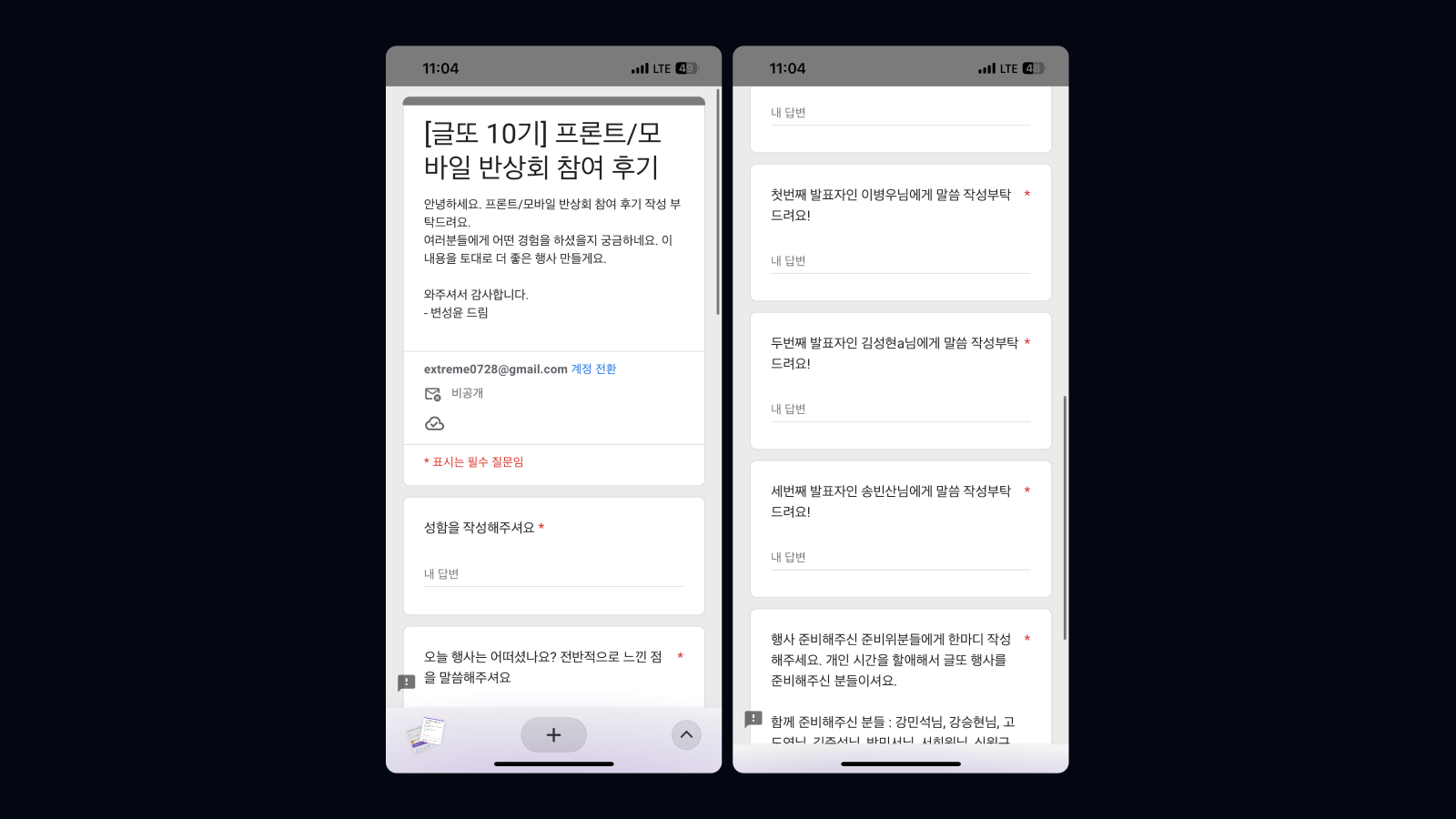 반상회 당일, 행사가 끝나갈 쯤 성윤님은 참여 후기를 요청하셨었어요. 반상회에 대한 전반적인 소감과 각 발표자들에게 피드백, 그리고 준비 위원회 분들에게 마음을 전달하는 내용을 작성할 수 있었어요. 벌써 종료된다는 것에 아쉬운 마음을 담아 열심히 구글 폼을 작성해서 제출했었죠!