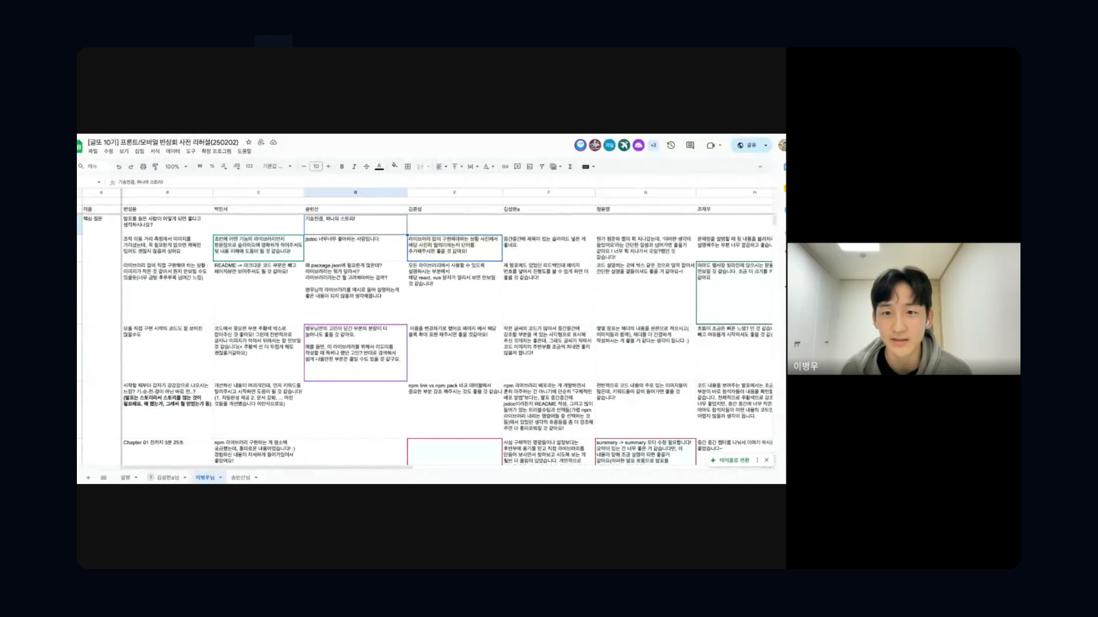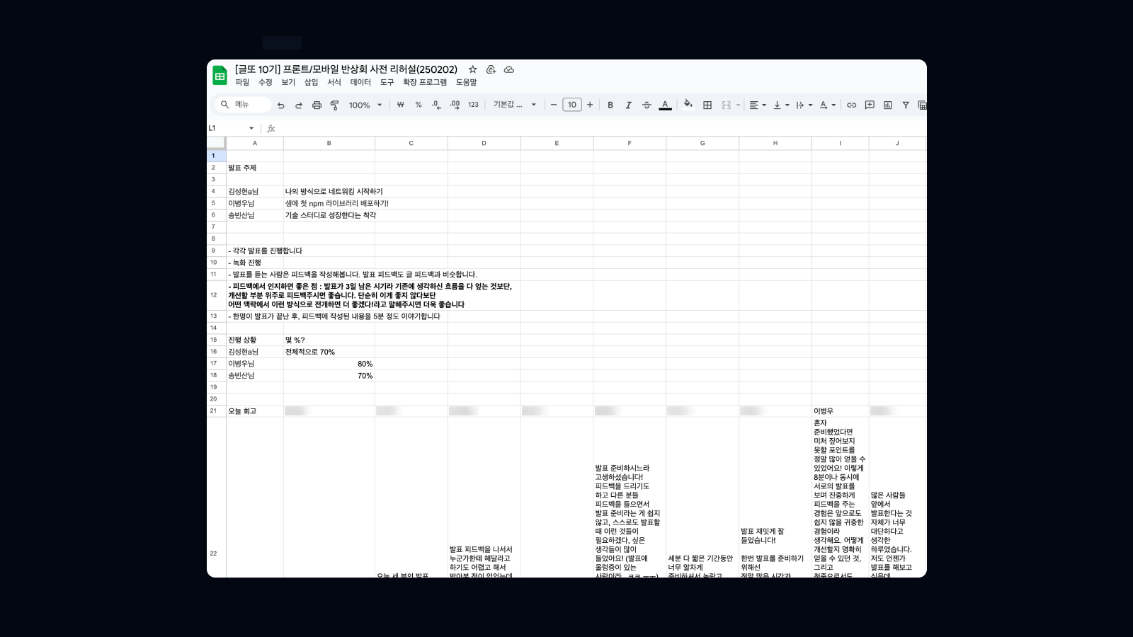 피드백 시간을 가졌어요. 발표자를 제외하고 총 8명이 동시에 피드백을 작성하기 시작했습니다.