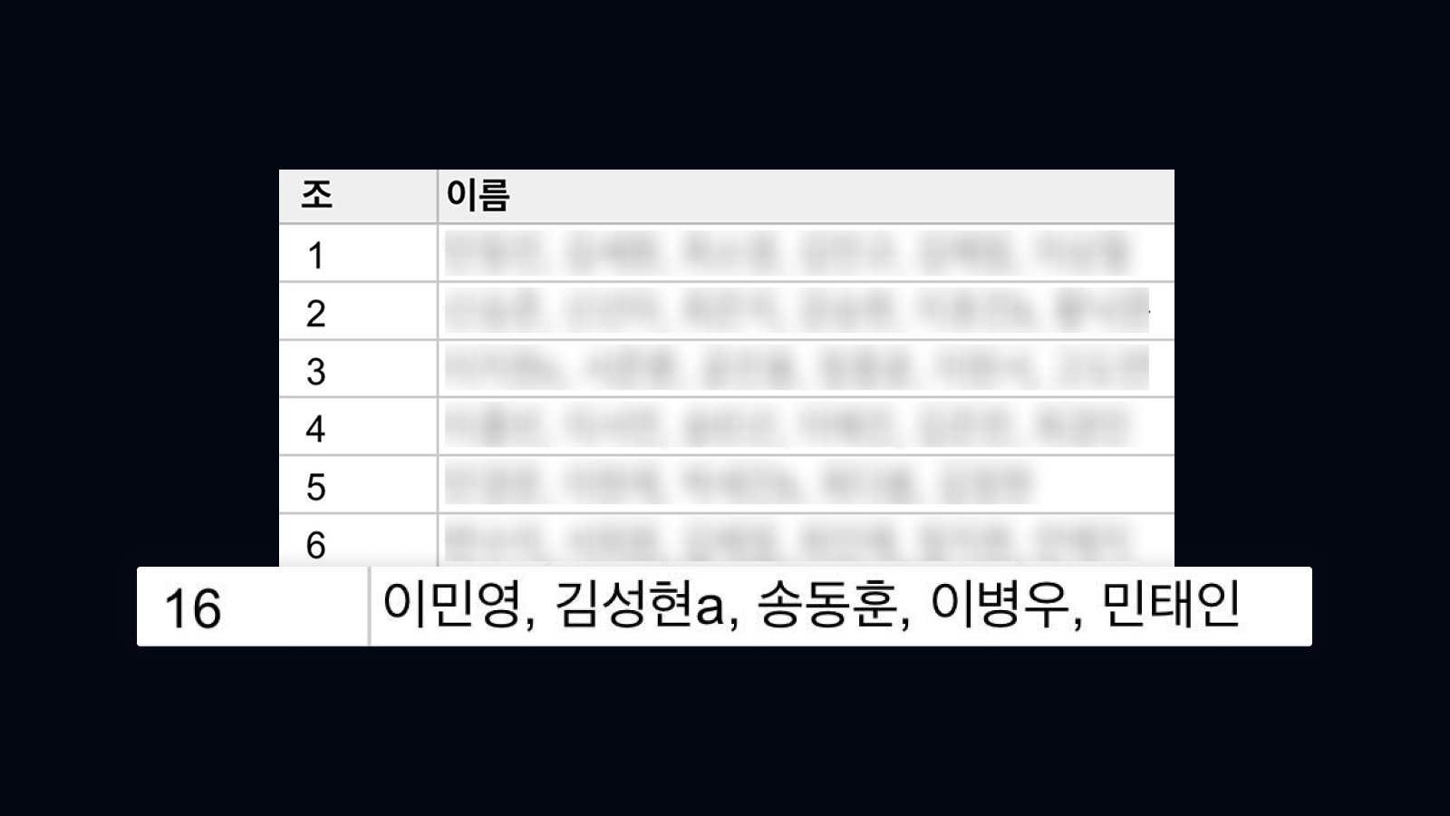 그렇게 발표 시간이 종료되고, 네트워킹이 시간이 시작되었어요! 슬랙을 통해 조 편성을 시트가 공유되었습니다. 저는 16조였어요.